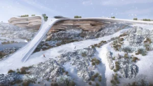 Part of the NEOM mountain range, Trojena introduces an unprecedented high-altitude tourism concept to the region. The project includes natural mountain resorts with 3,600 rooms, 30 kilometers of ski slopes covered in snow for three months each year, an artificial lake, The Vault digital and recreational hub, and 2,200 residential units. The development symbolizes innovation and harmony between nature and technology.